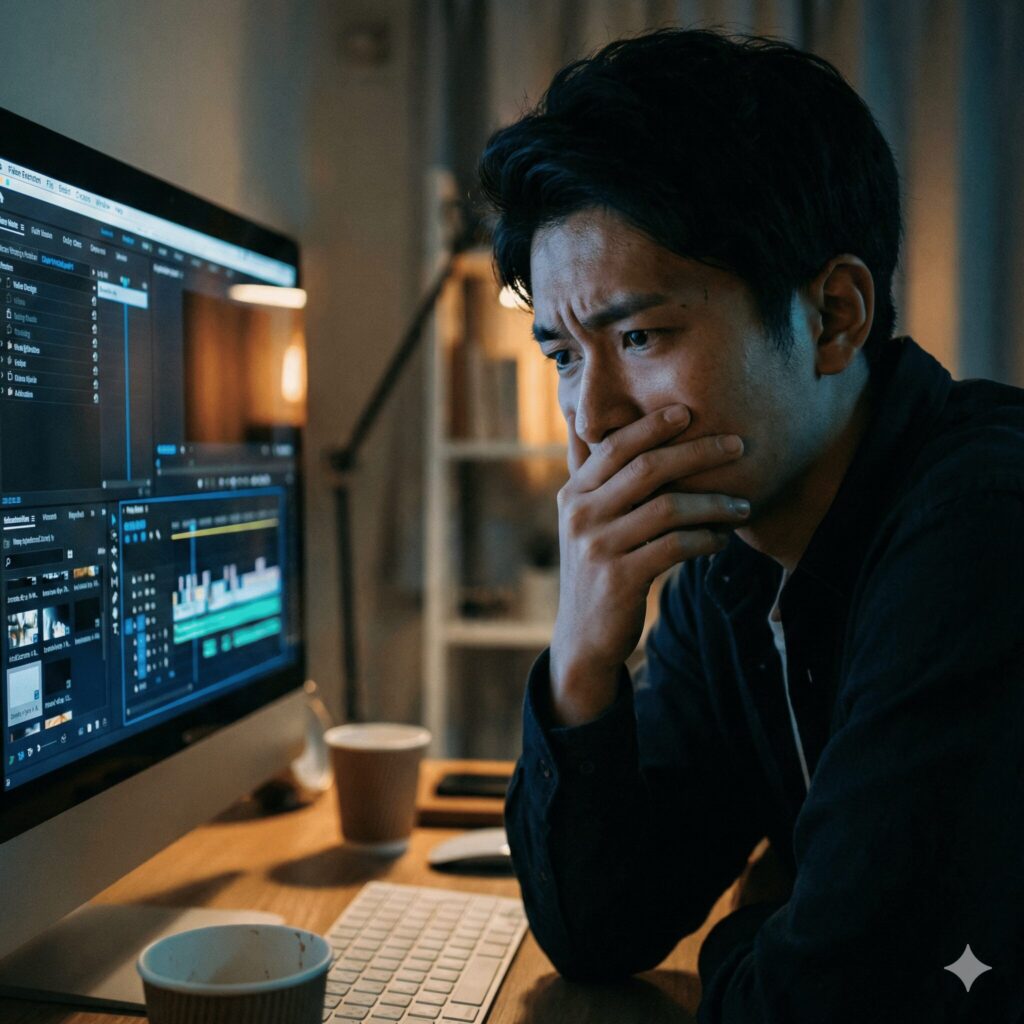 第三に「低単価案件での消耗」 です。効率的なワークフローを知らないため、1本の編集に膨大な時間を費やし、時給換算で数百円という現実に直面します。